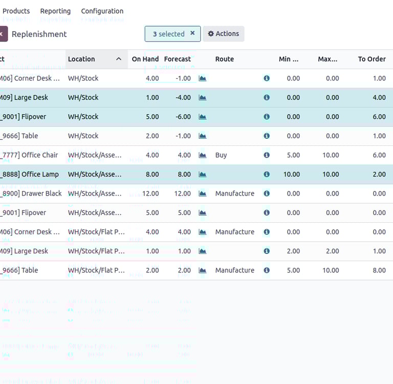 Odoo te permite controlar varios almacenes y ubicaciones, anticipar niveles de inventario, automatizar el reabastecimiento y acceder a información de stock en tiempo real.